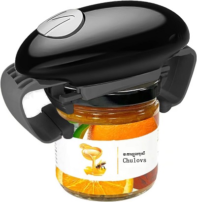 Grazie al funzionamento automatico, basta posizionare l’apriscatole sul barattolo e premere un pulsante. Il dispositivo ruota e apre il coperchio senza bisogno di forza.